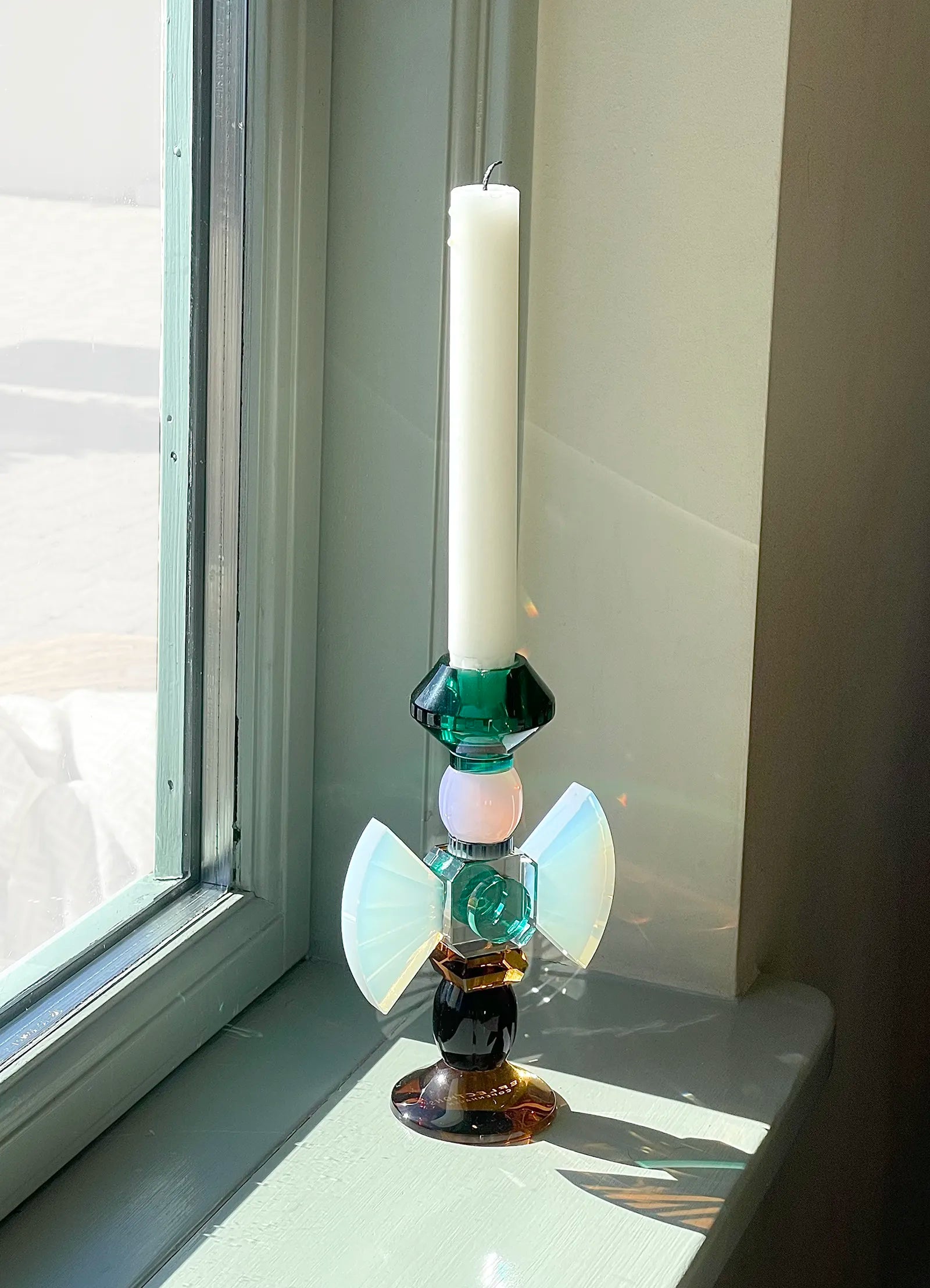 The Carmina Candle Holder is a striking balance of structure and luminosity. Its opal-toned crystal wings rise from an amber base, while a floating green crystal circle, seamlessly infused within clear crystal, adds an element of depth and intrigue. Finished with an emerald candle holder, this piece embodies both strength and elegance, making it a refined yet artistic addition to any space.