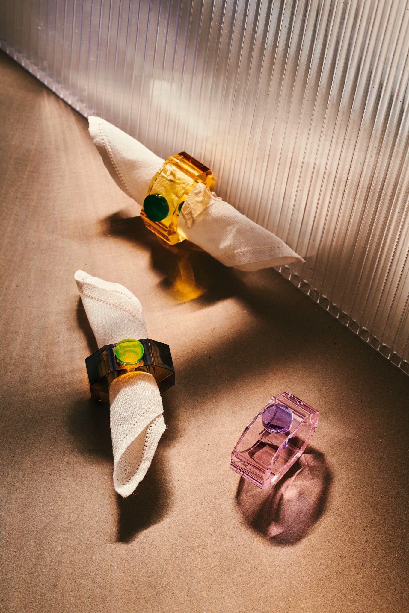 These incredible jewel-like napkin rings, sold in pairs, are a simple and modern twist to your table setting. Not only are they handcrafted in the highest quality crystals, but they are thoughtfully paired together for a bold and energetic effect. These glimmering and dazzling napkin rings will bring a star-studded effect to any table setting.