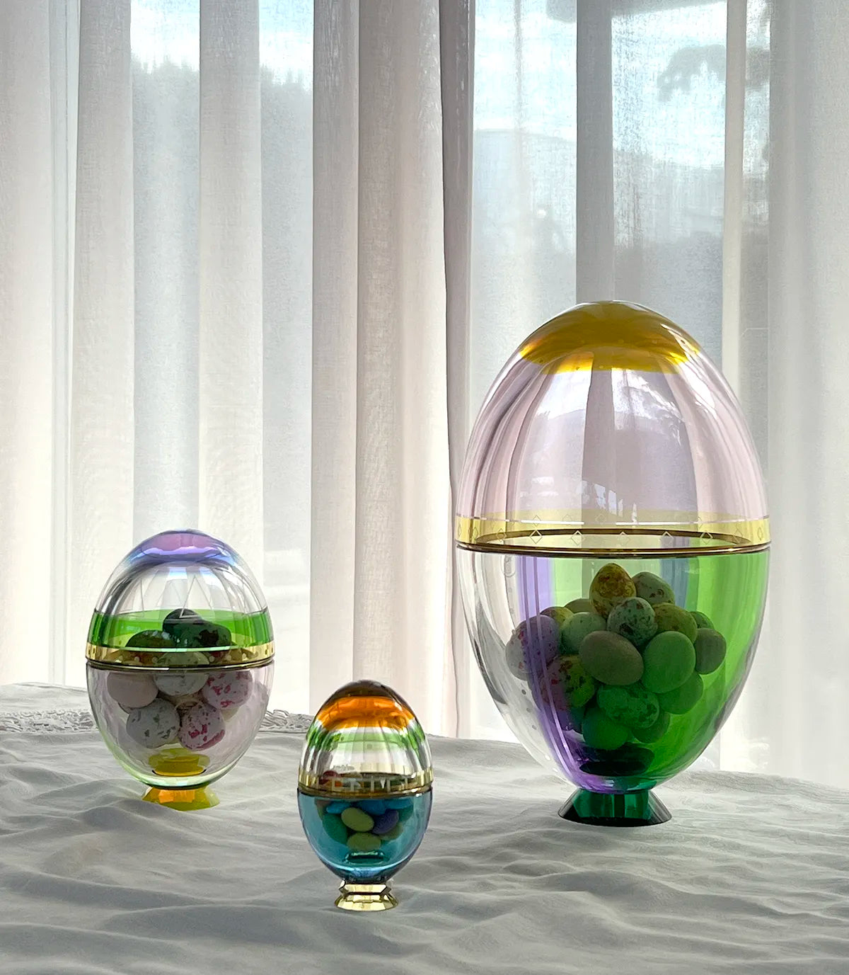 Introducing a playful eggs-travaganza! Inspired by the festive Easter season, the Fantasia Eggs embody a fusion of naughtiness and style. These crystal bonbonnieres are designed to safeguard your most precious treasures. The Fantasia Egg features two delicately interlocking pieces, gracefully rising on a crystal base with a captivating design that combines colours, meticulous finishes, and hand-craved shapes that conceal a magical symbolism. A truly unique object exuding enchantment and opulence. Available in three sizes, inviting you to create original and wonderful combinations that will elevate your space.