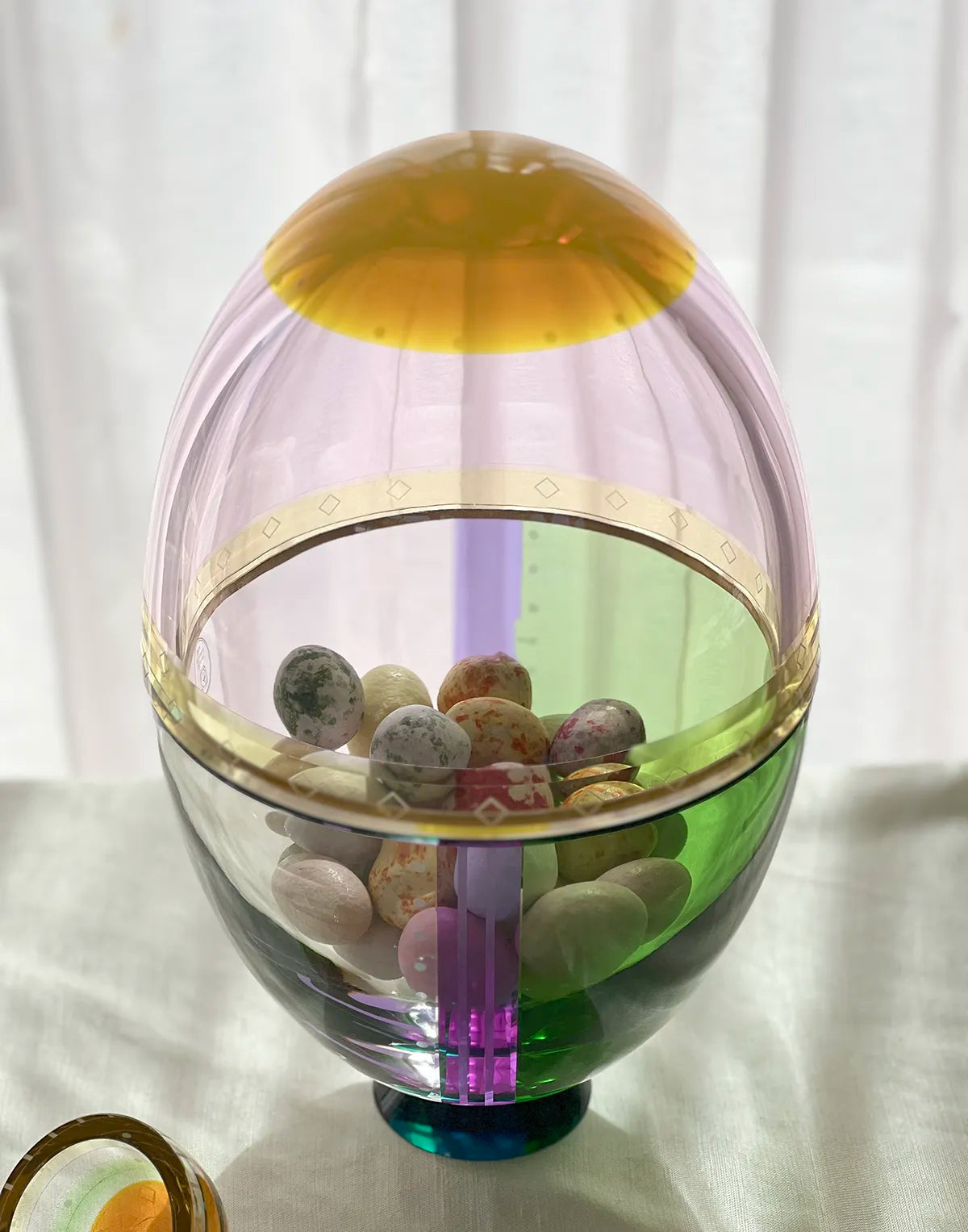 Introducing a playful eggs-travaganza! Inspired by the festive Easter season, the Fantasia Eggs embody a fusion of naughtiness and style. These crystal bonbonnieres are designed to safeguard your most precious treasures. The Fantasia Egg features two delicately interlocking pieces, gracefully rising on a crystal base with a captivating design that combines colours, meticulous finishes, and hand-craved shapes that conceal a magical symbolism. A truly unique object exuding enchantment and opulence. Available in three sizes, inviting you to create original and wonderful combinations that will elevate your space.