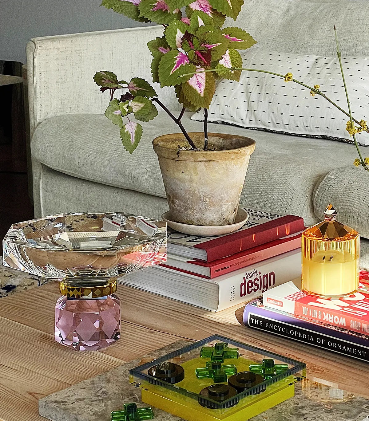 The Arizona Bowl captivates with its sculptural silhouette and unexpected contrasts. A clear crystal bowl appears elevated by a faceted rose base, with a band of yellow crystal - etched in diamond-shaped facets - introducing texture and light. Just beneath, a precise line of cobalt crystal cuts through the softness, adding a dynamic tension that enhances the design’s visual rhythm. Both functional and expressive, it brings a refined boldness to any setting.